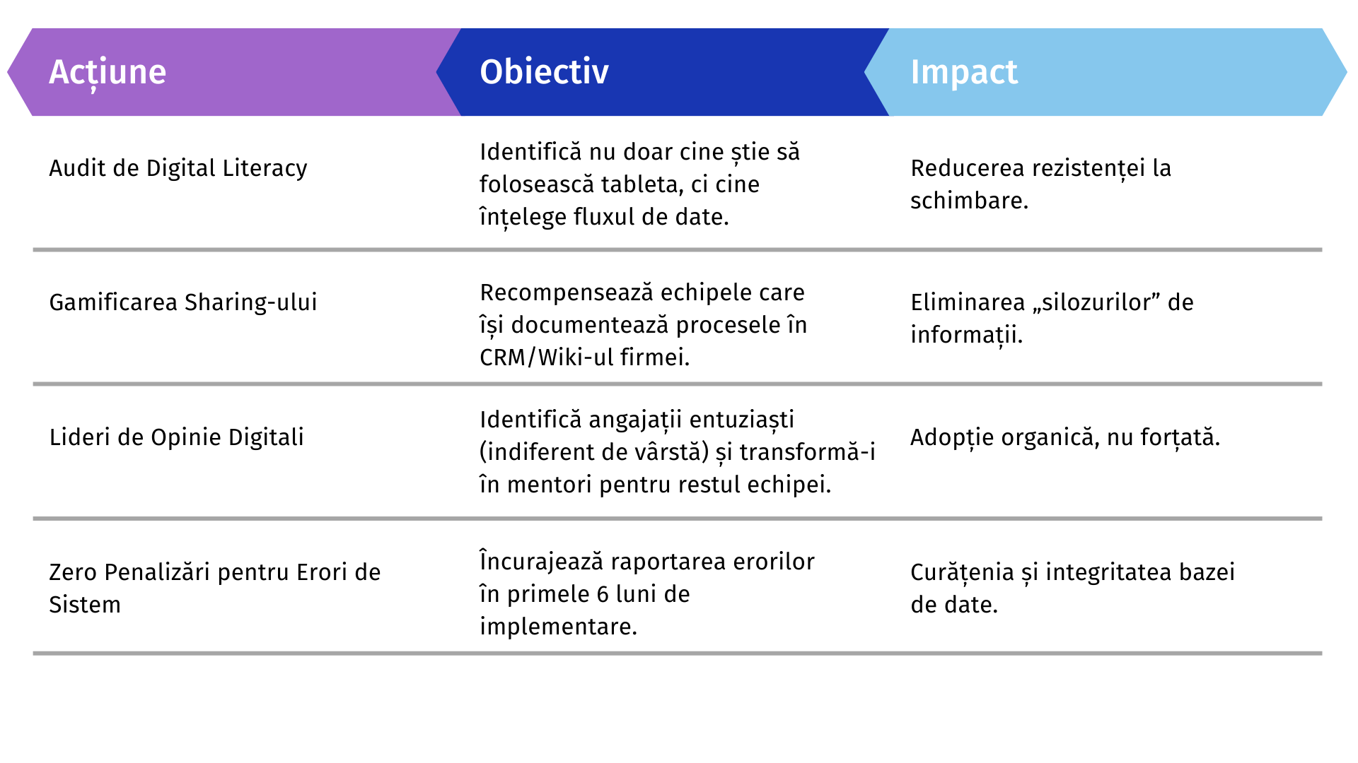 Rolul mediator al „Sharing-ului”: Nu există digitalizare fără partajare. Dacă angajații nu au încredere să urce datele (ceea ce stiu, nu doar ceea ce află) în timp real în sistem, veți avea un „cimitir digital” de fișiere nefolosite. Digitalizarea reușește doar atunci când procesul de knowledge sharing este recompensat, nu doar monitorizat.