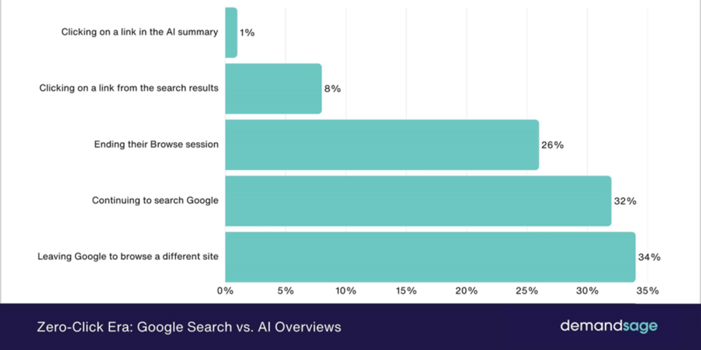 Traficul tradițional organic nu dispare peste noapte, dar date recente arată pierderi semnificative de clickuri și vizibilitate pentru site‑urile care nu țin cont de AI Overviews. Potrivit unui studiu Demandsage, prezența AI Overviews într‑un SERP scade rata de click (CTR) organică pentru poziția #1 de la ~7,3% la ~2,6%, adică o reducere de ≈ 34,5%. De asemenea, numărul utilizatorilor care dau click pe linkurile clasice într-un rezultat de căutare cu AI summary este de doar ~8%, față de ~15% când nu există summary.