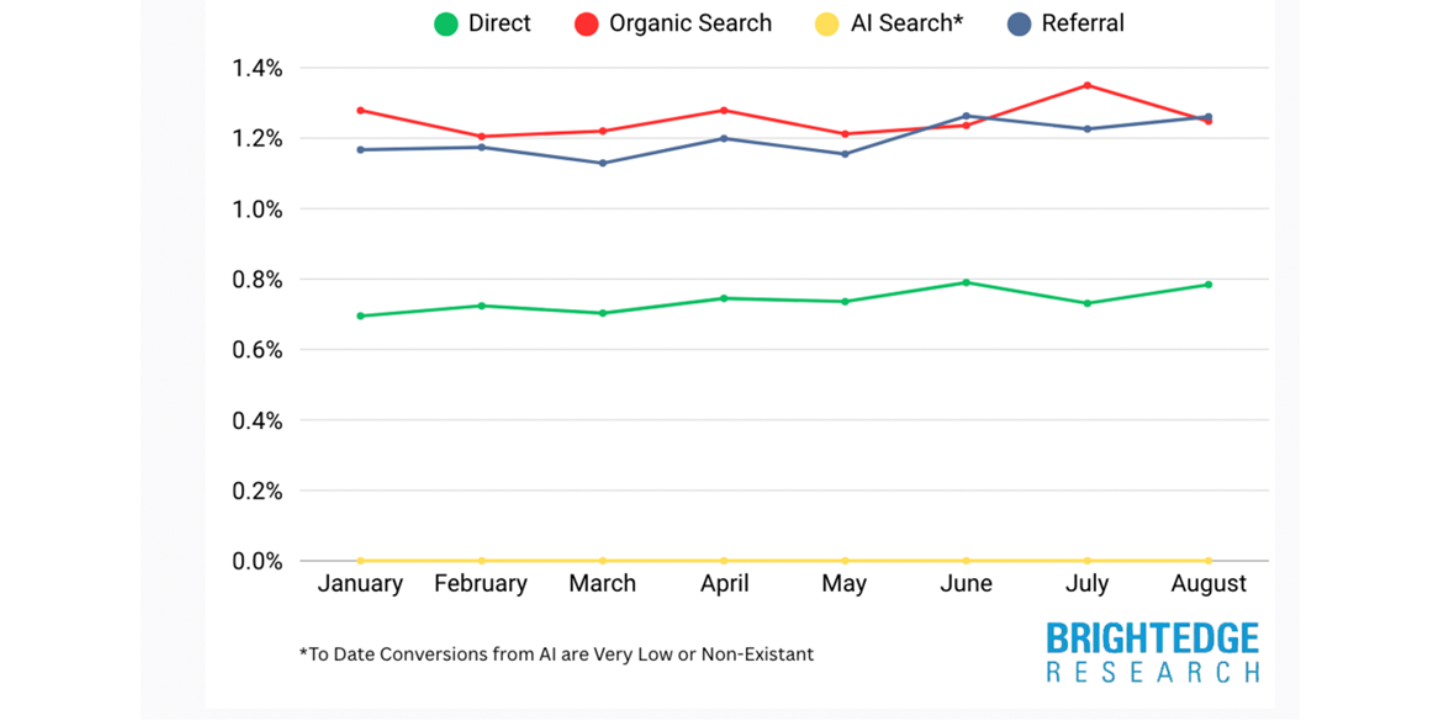 În același timp, traficul provenit din referințe AI (AI referrals) crește, dar încă reprezintă sub 1% din totalul traficului pentru foarte multe site-uri, conform raportului BrightEdge: între ianuarie și august 2025, creșterile sunt lunare, dar cota totală de trafic generat de AI search/referrals rămâne sub pragul de 1% în majoritatea cazurilor.