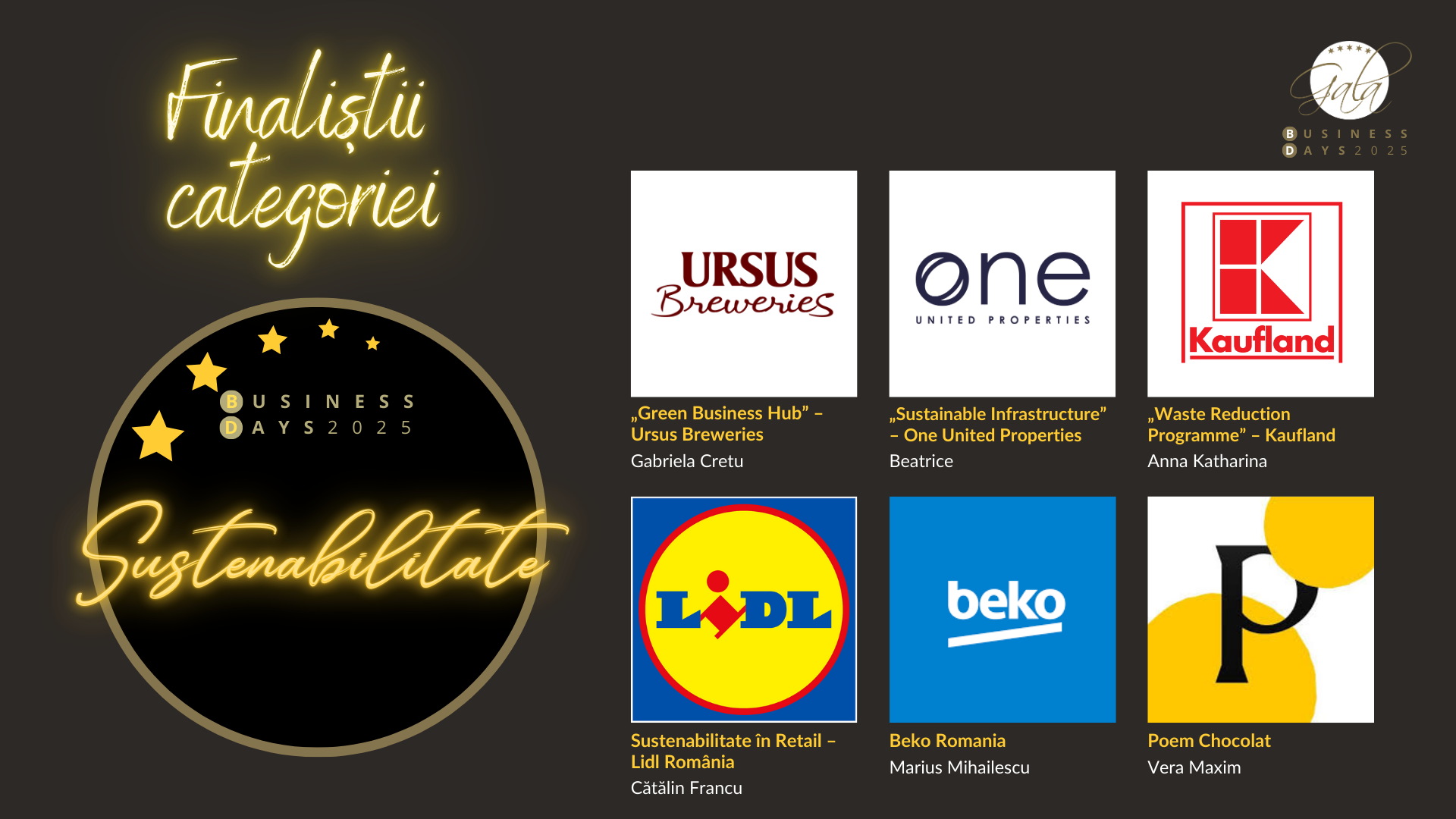 „Green Business Hub” – Ursus Breweries • „Sustainable Infrastructure” – One United Properties • „Waste Reduction Programme” – Kaufland România • Sustenabilitate în Retail – Lidl România • Beko • Poem Chocolat