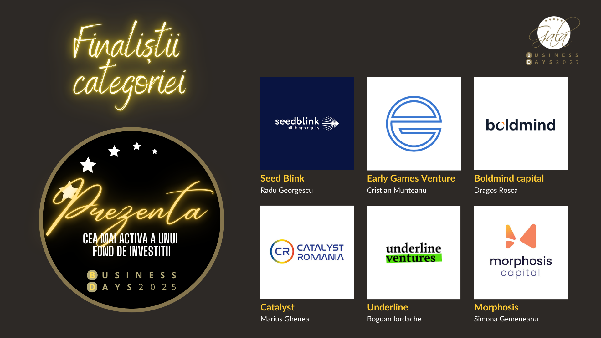 SeedBlink • Early Game Ventures • Boldmind Capital • Morphosis • GapMinder • Catalyst România • Underline